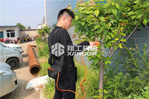 2.將電動修枝剪固定連接電源穿過背包并連接到電池,穿戴好背包(把剪刀電源線穿入背帶的指定固定扣,防止使用時(shí)剪到電線)