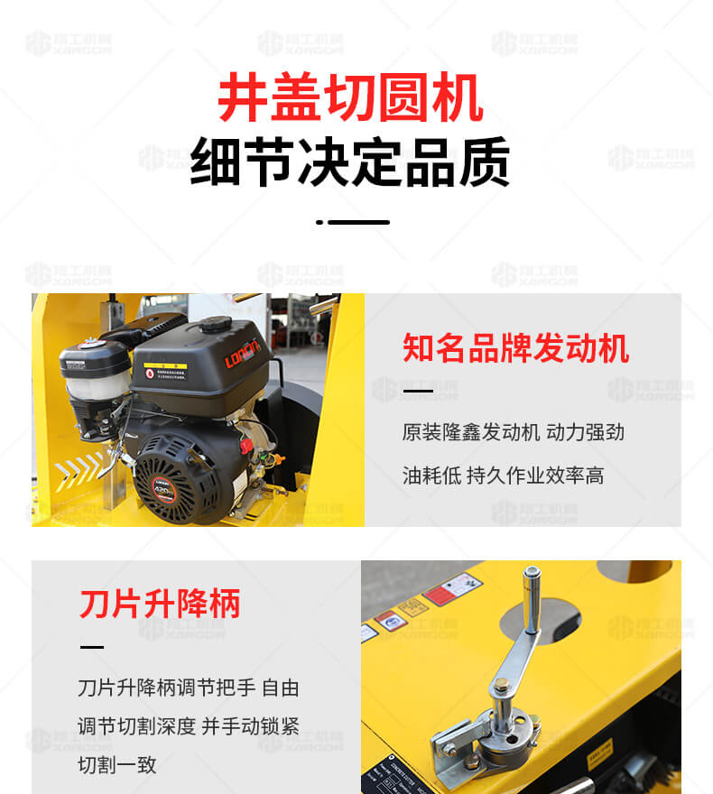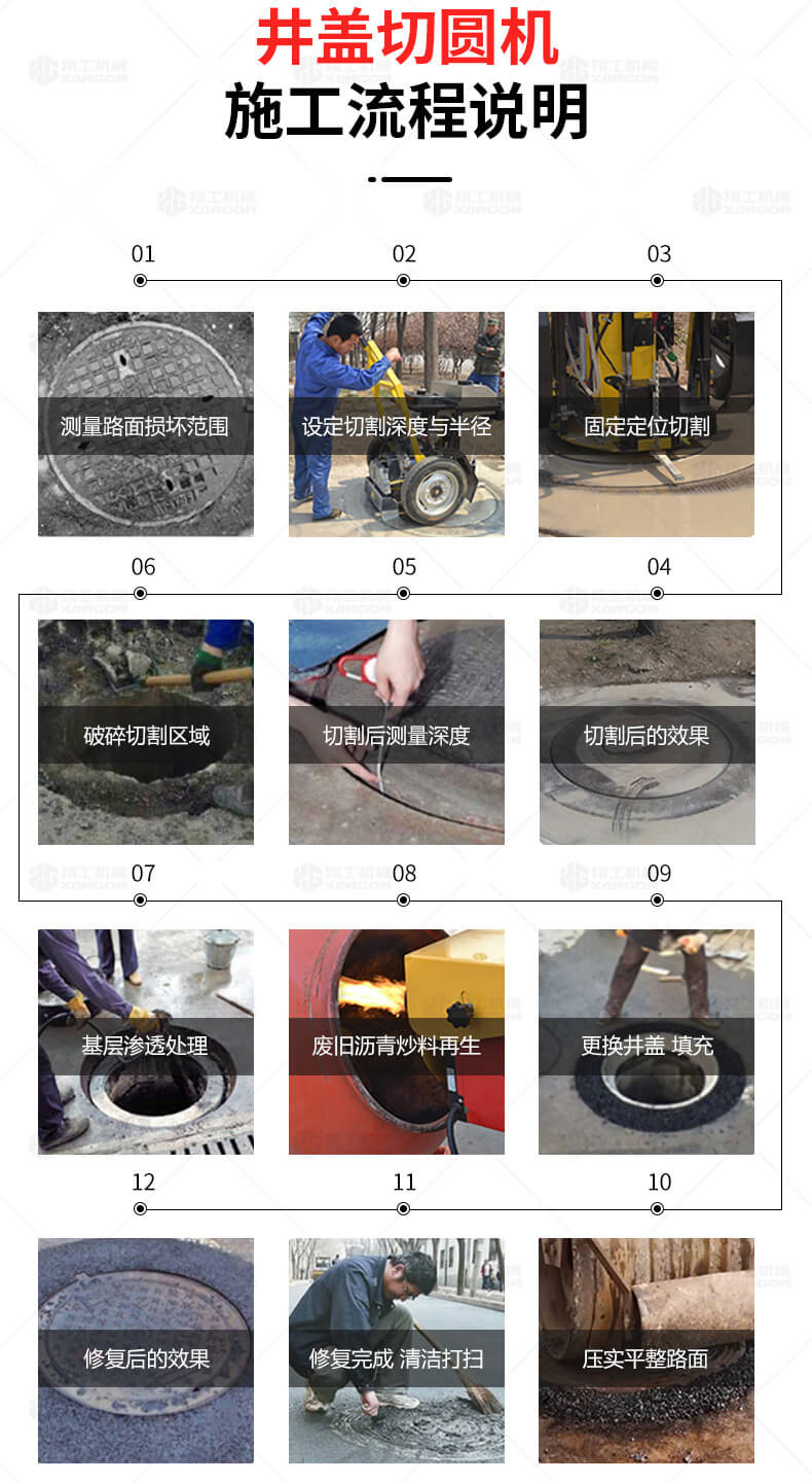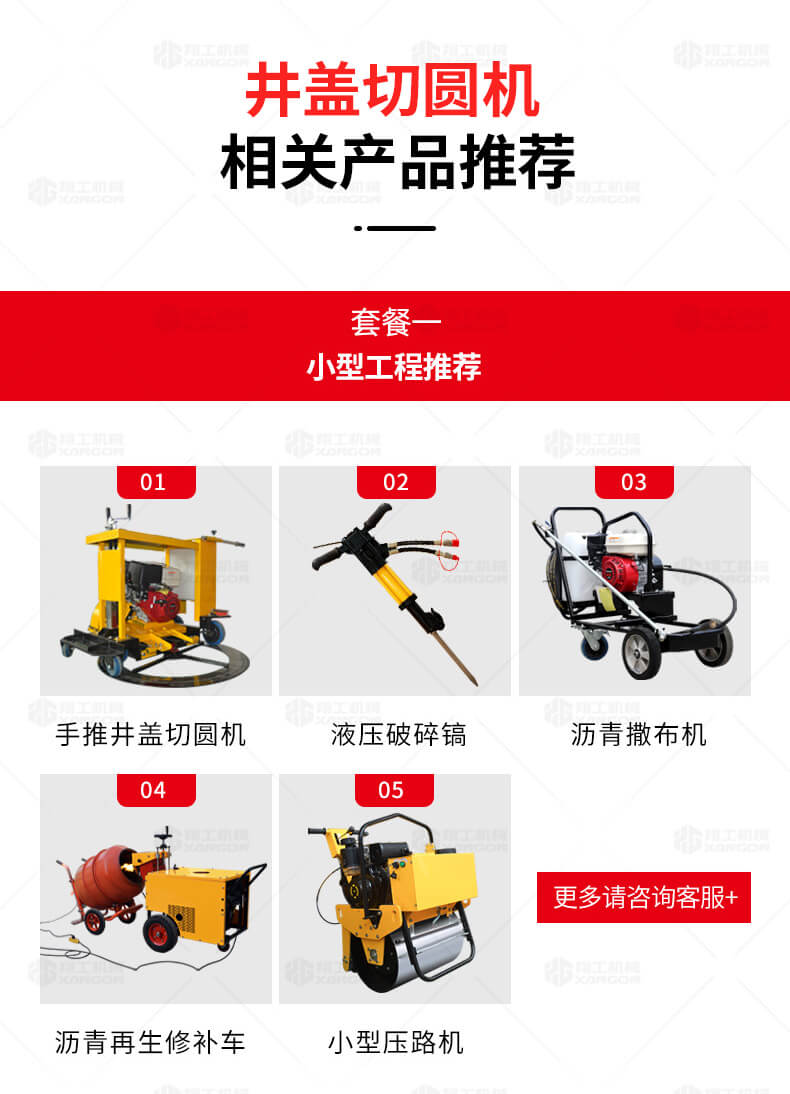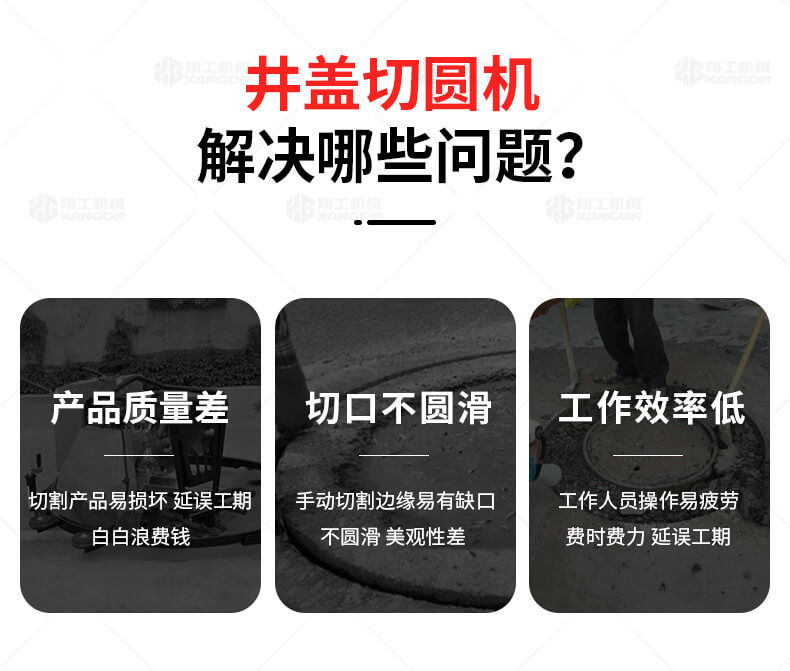 XG-1500型井蓋切割機(jī),專門用于對城市道路中機(jī)動(dòng)車道等井蓋周圍的水泥混凝土或?yàn)r青路面進(jìn)行圓形切割。為清楚井蓋周圍的破損路面提供分割區(qū)域,恢復(fù)后的地面美觀,延長了路面的使用壽命。