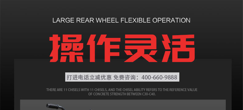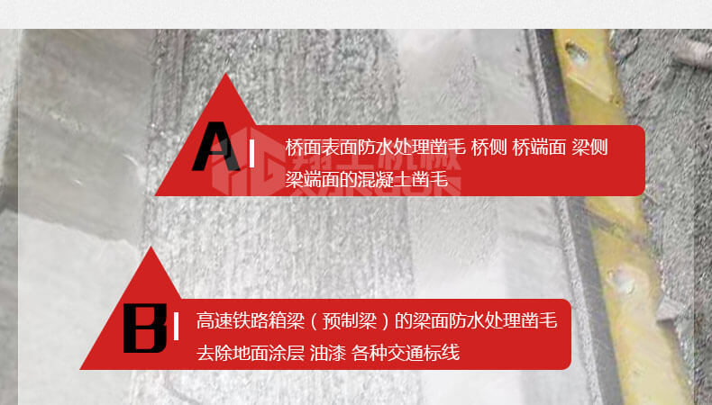 8、震動傷害小。 鑿毛機可在對主體無任何破壞的情況下,在1-100mm鑿剔深度之間自由掌控,鑿除混凝土表面光滑面積可達100%,鑿毛能力可根據(jù)混凝土的不同強度和深度,每小時可達到4m2--100m2的工作量。與傳統(tǒng)鑿毛工藝相比,可明顯加速工程進度,降低勞動消耗,減少環(huán)境污染,節(jié)省工程造價,實現(xiàn)理想的工程質量,具有廣闊的市場前景。