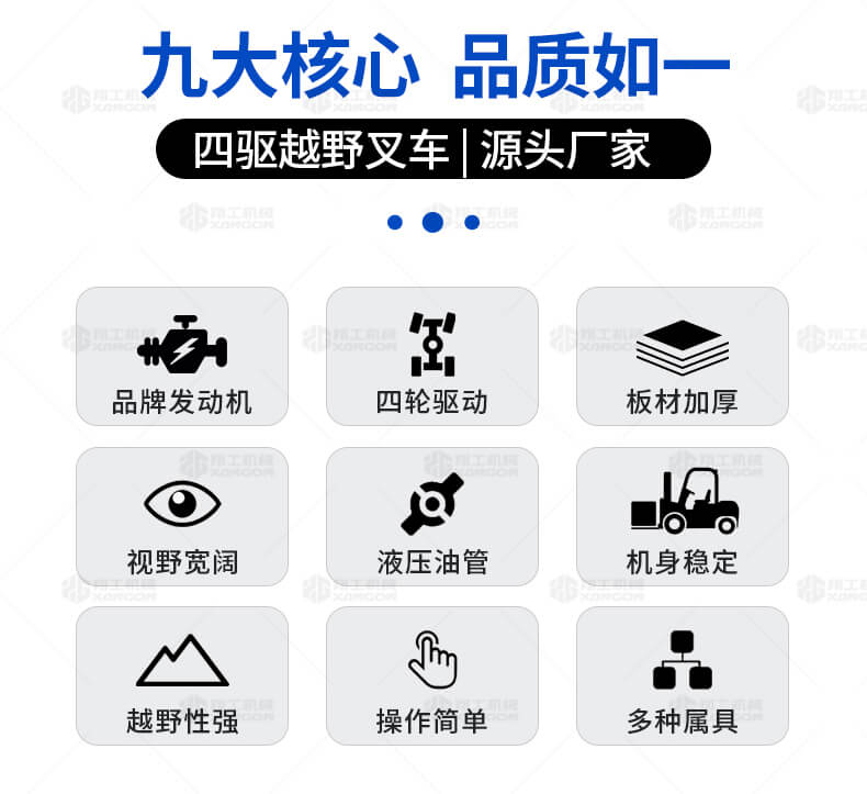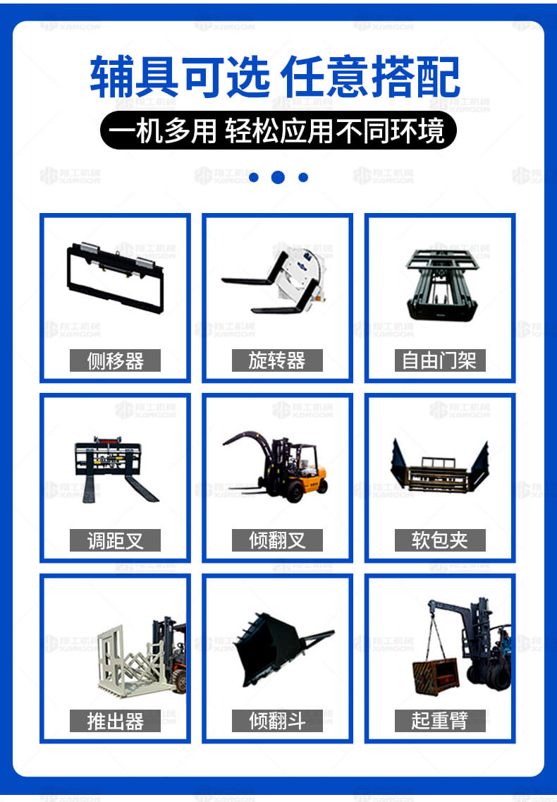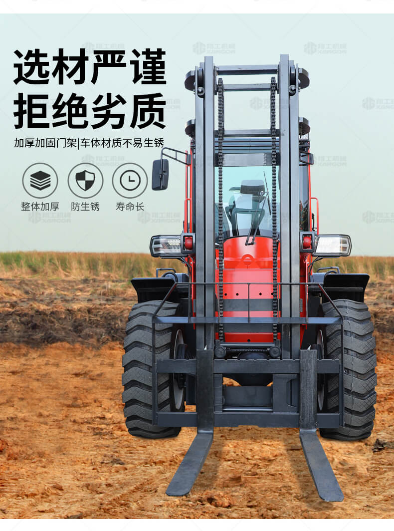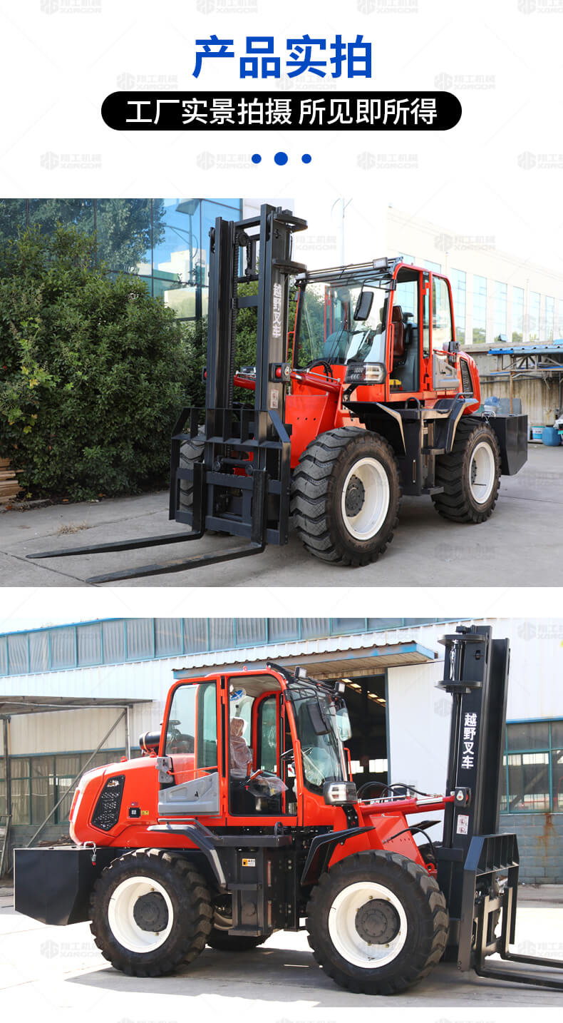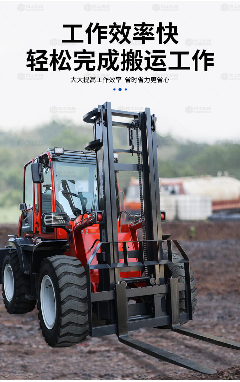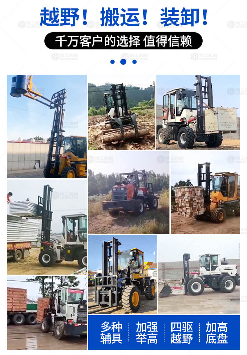 越野叉車可以在坡地和不平地面上進(jìn)行貨物裝、卸、堆垛及搬運(yùn)作業(yè),具有良好的機(jī)動性、越野性可靠性。其功能多樣,可搭配側(cè)移器、調(diào)距叉、旋轉(zhuǎn)器、軟包夾、推出器、側(cè)翻叉、側(cè)翻斗、起重臂等工具完成不同的工作。