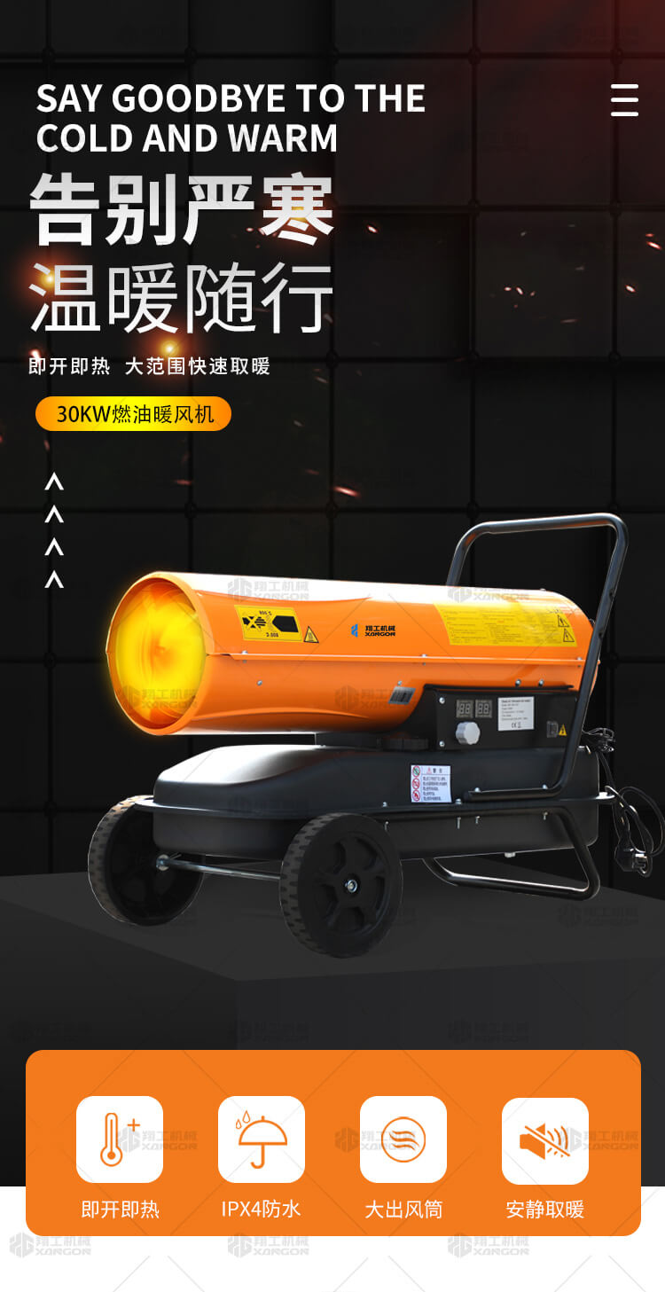 30KW燃油暖風(fēng)機適用范圍: 工廠車間,物資倉庫,防潮烘干,局部采暖 建筑工地,道路橋梁,水泥養(yǎng)護,野外采暖 石油鉆井,煤炭礦區(qū),除冰防凍,設(shè)備保溫 鐵路機場,游艇船舶,油漆干燥等等。
