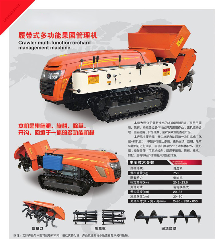 開溝施肥自動回填一次性完成(化肥+有機肥)、單獨開溝施土雜肥、更換回填、旋耕、除草裝置后可進行回填、旋耕和除草作業(yè);該機體積小,操作靈便,可原地轉向,適用于葡萄、果樹、核桃、枸杞、藍莓等經濟作物的開溝施肥作業(yè)。