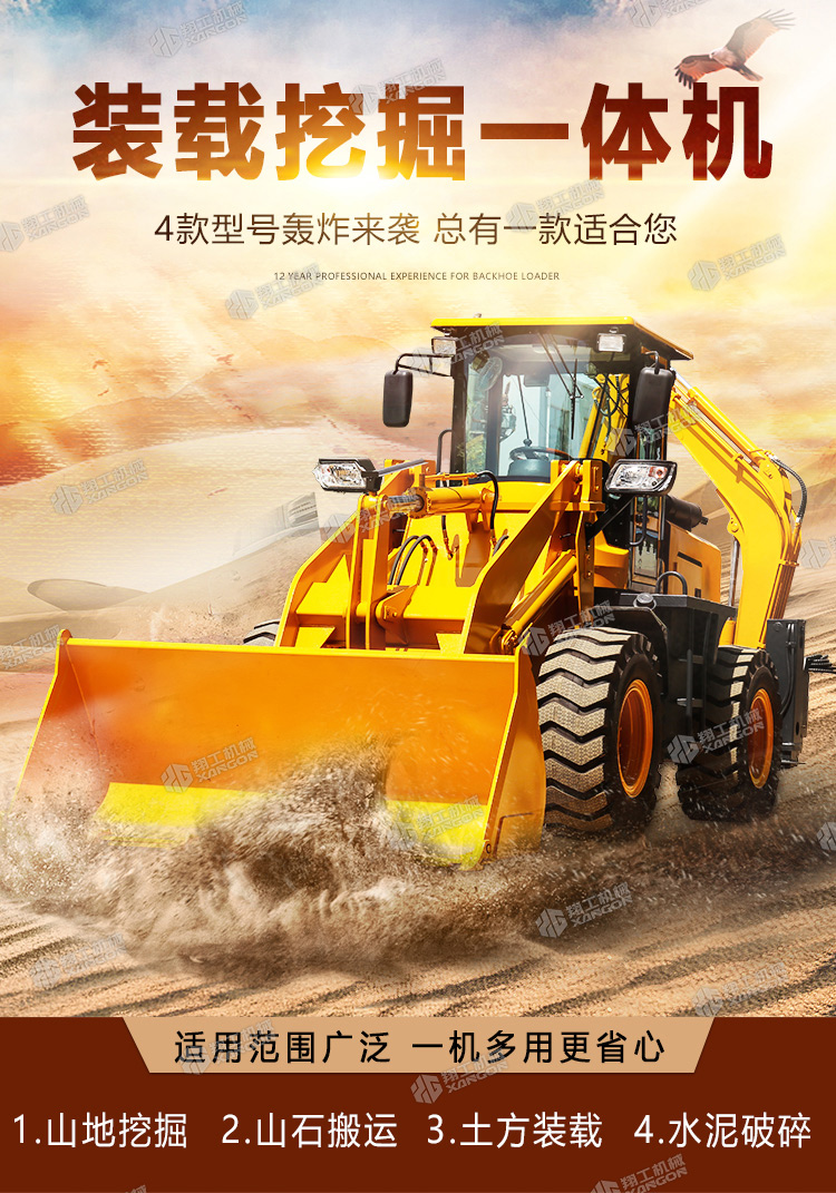 挖掘裝載一體機俗稱“兩頭忙”。因為它具有獨特的構(gòu)造,前端是裝載裝置,后端為挖掘裝置。在工地內(nèi),您只需要轉(zhuǎn)動一下座椅,即可完成從裝載機到挖掘機操作手角色的轉(zhuǎn)變?!皟深^忙”屬于小型多功能工程機械的一種,一般在大工程完成后的小工程中使用。它可配多種工作裝置及輔具,進行挖掘、鏟裝、路面破碎、平整場地、開挖溝渠、鋪設管道等多種作業(yè)。