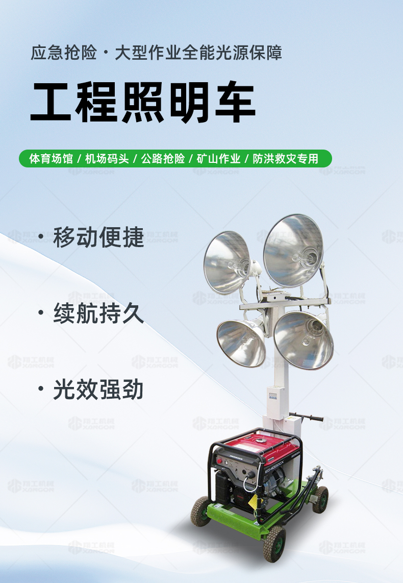 工程照明車XZM-1000B用于體育場(chǎng)館、機(jī)場(chǎng)、碼頭等大型公共場(chǎng)所,公路、鐵路、電力等緊急搶險(xiǎn)現(xiàn)場(chǎng),露天采礦現(xiàn)場(chǎng),以及防洪防汛、搶險(xiǎn)救災(zāi)現(xiàn)場(chǎng)等其它需要緊急備用光源、電源的場(chǎng)合