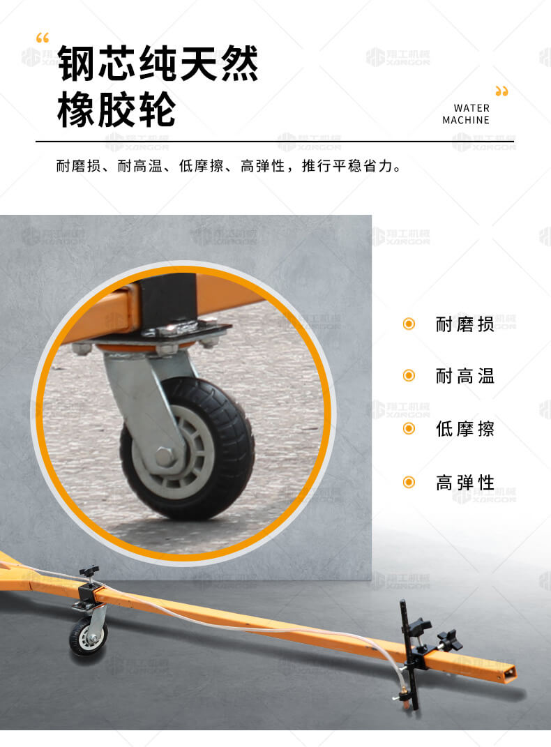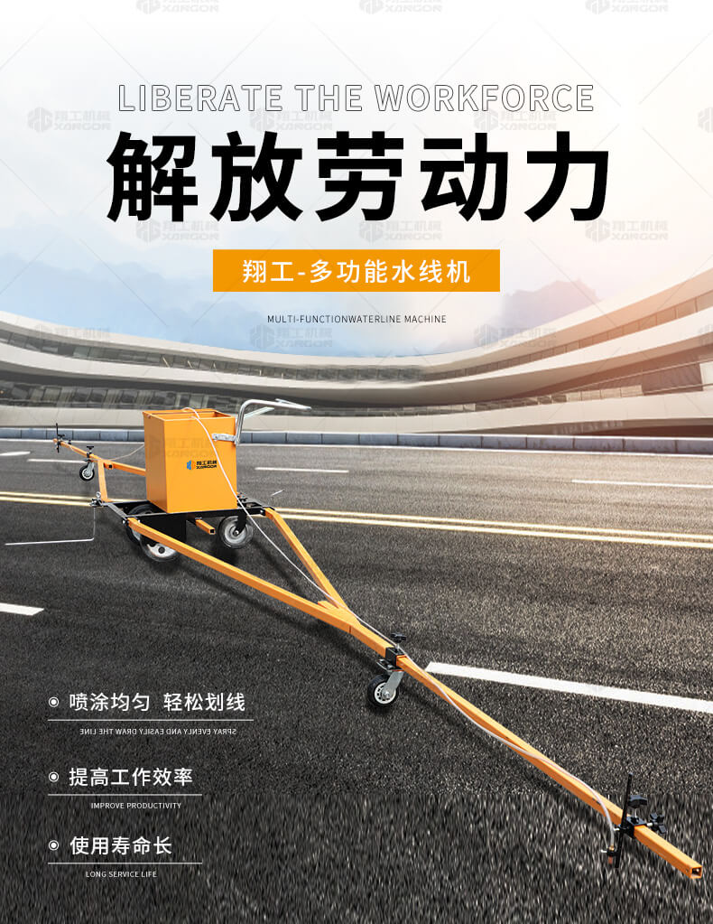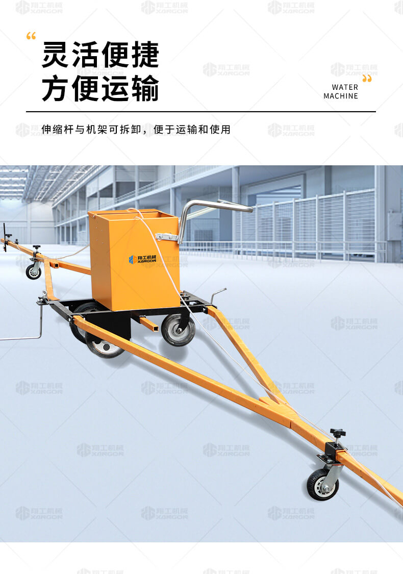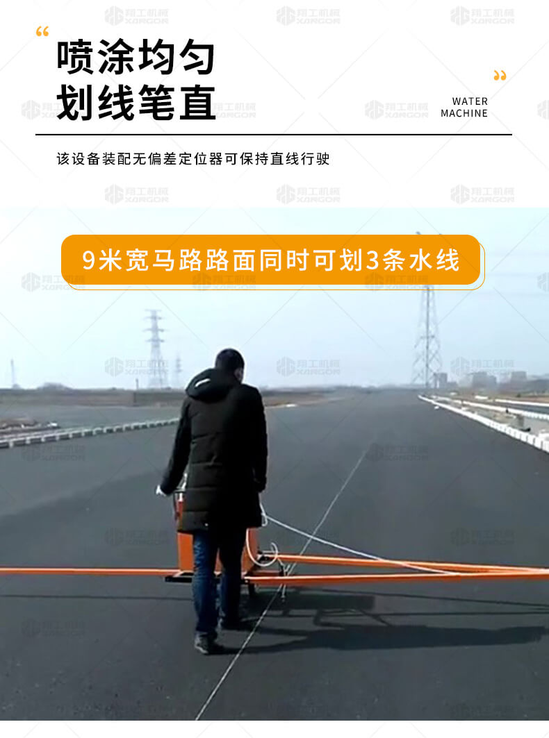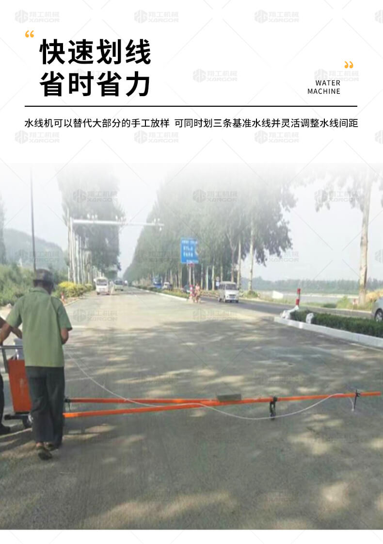 水線車是標(biāo)線施工前序工作中施劃水線放樣的專用設(shè)備。 水線是標(biāo)線施工前必不可少的工序,水線機(jī)可以替代大部分的手工放樣,降低勞動強(qiáng)度,提高工作效率,省時省力。 本產(chǎn)品可同時劃三條基準(zhǔn)線(水線),可靈活調(diào)整水線間距;水線架和伸縮桿可折疊、拆卸,便宜運輸。 在施工前,在所要施劃標(biāo)線的位置上需先涂劃水線,用以引導(dǎo)標(biāo)線劃線機(jī)的施劃。