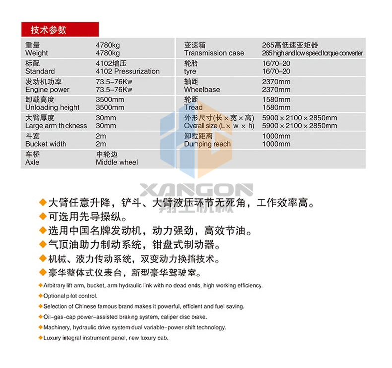主要用于鏟裝土壤、砂石、石灰、煤炭等散狀物料,也可對(duì)礦石、硬土等作輕度鏟挖作業(yè)。換裝不同的輔助工作裝置還可進(jìn)行推土、起重和其他物料如木材的裝卸作業(yè)。在道路、特別是在高等級(jí)公路施工中,裝載機(jī)用于路基工程的填挖、瀝青混合料和水泥混凝土料場的集料與裝料等作業(yè)。