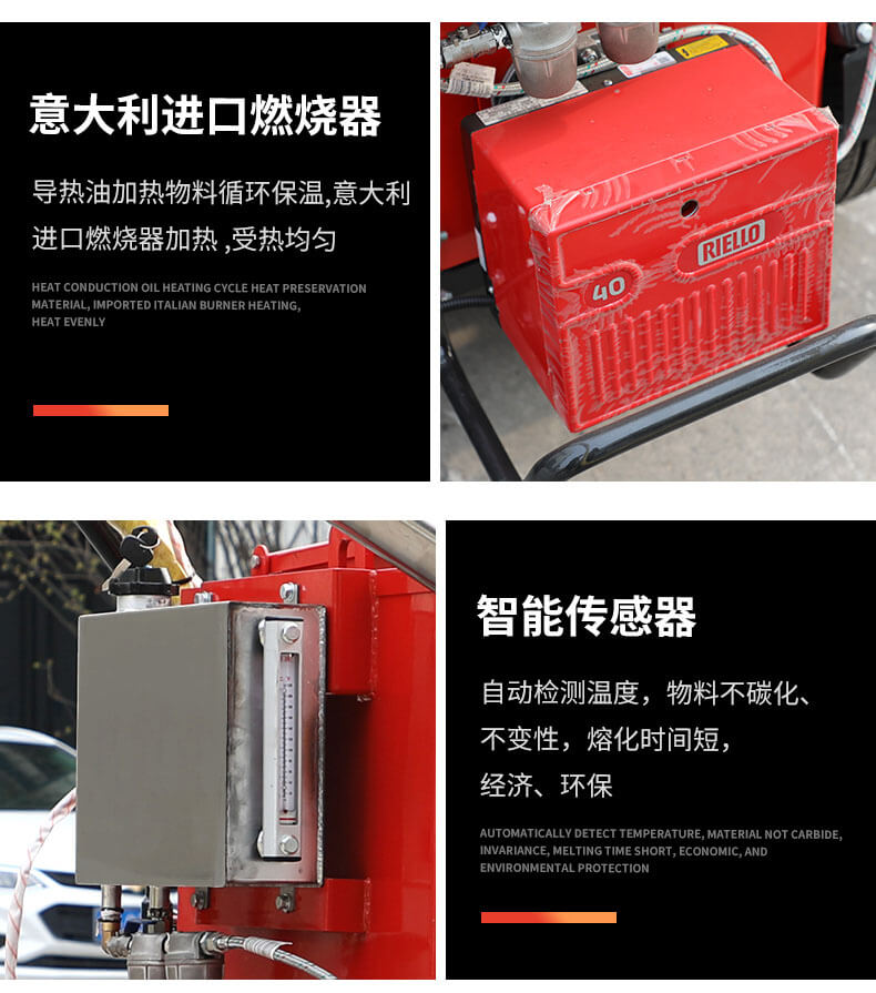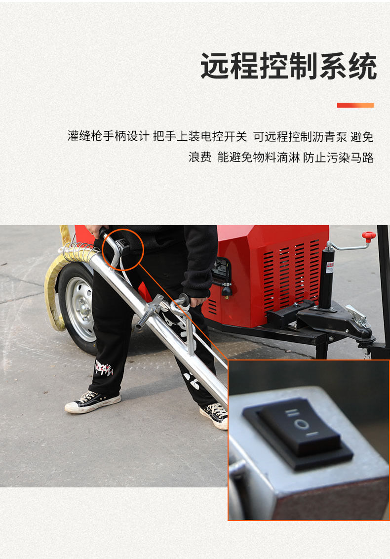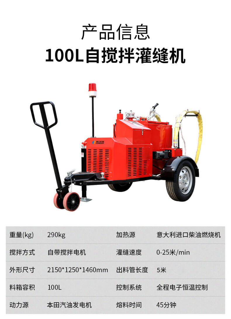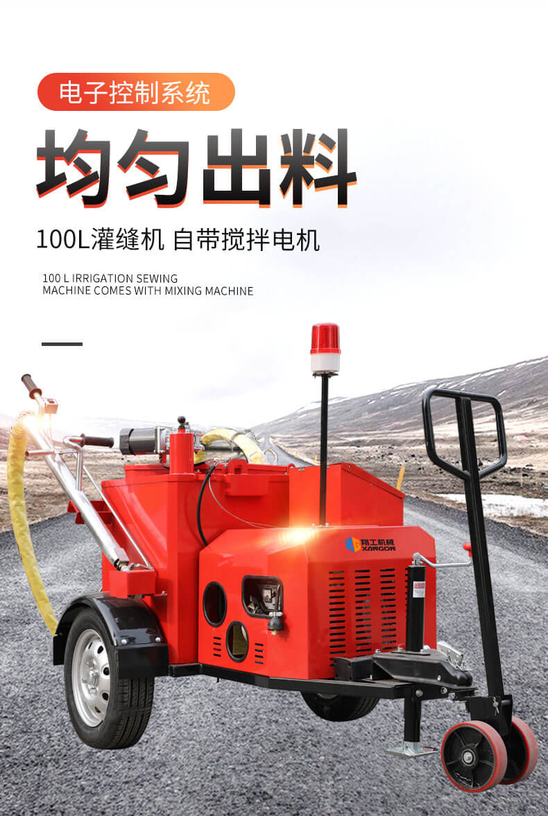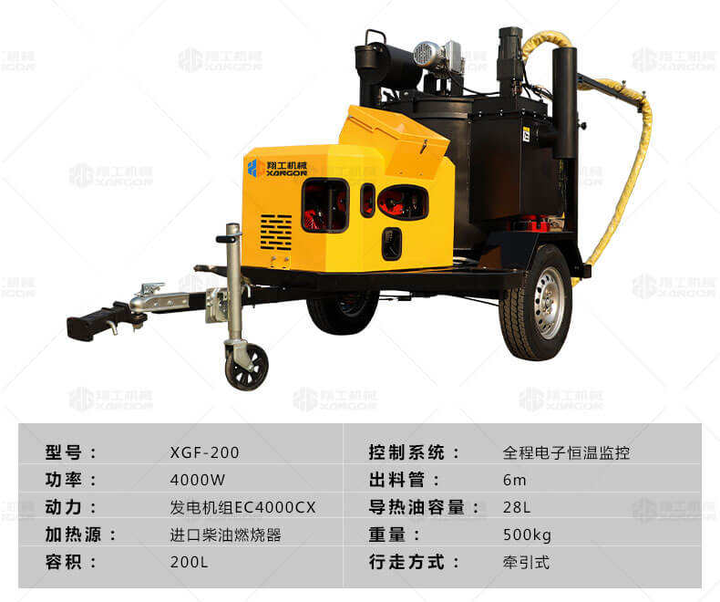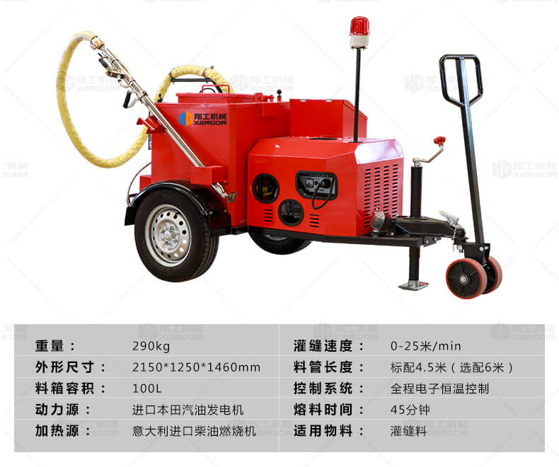 灌縫機主要有手推式和自行式手持灌縫管操作,采用進口柴油燃燒器加熱。在工作時首先在料箱內加入瀝青或灌縫膠,啟動發(fā)電機供電,依次間斷打開導熱油泵開關,燃燒器開關,出料管加熱開關;