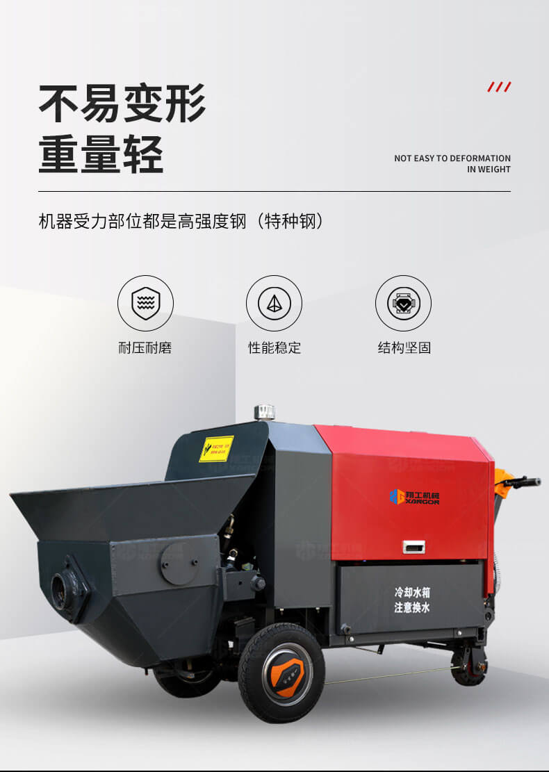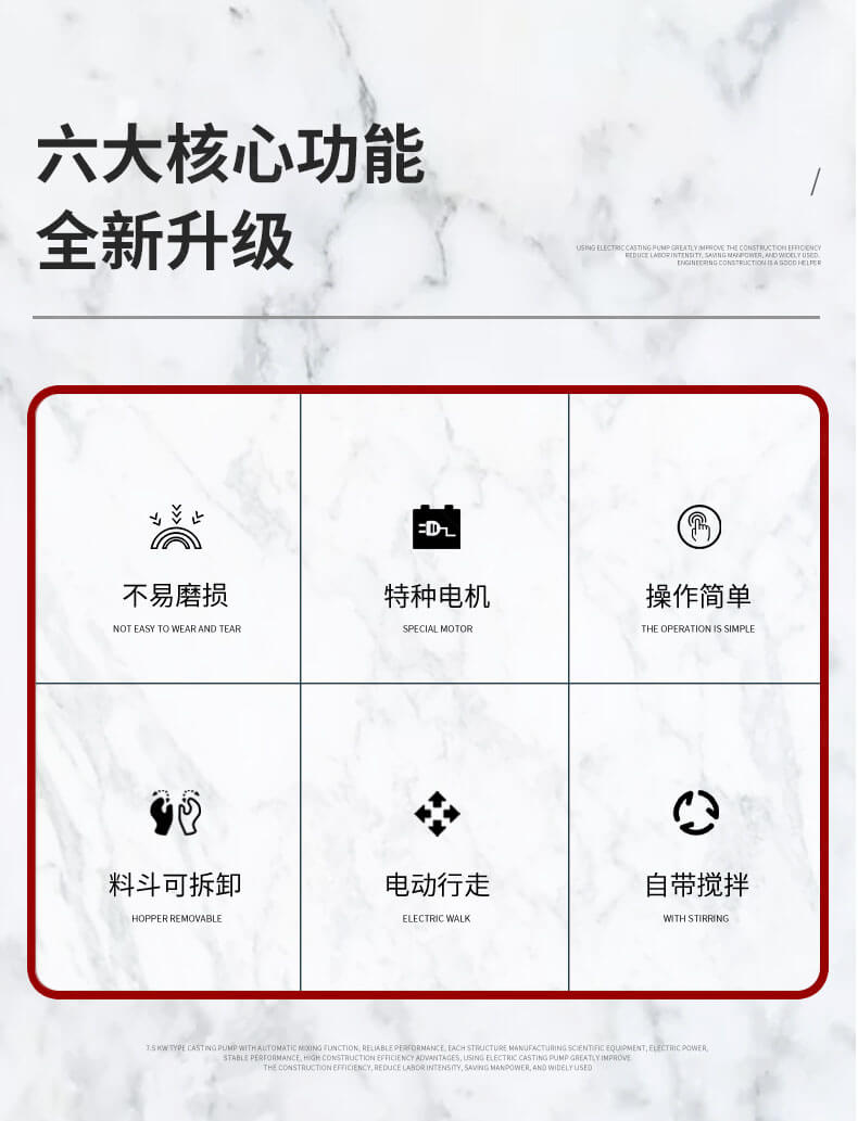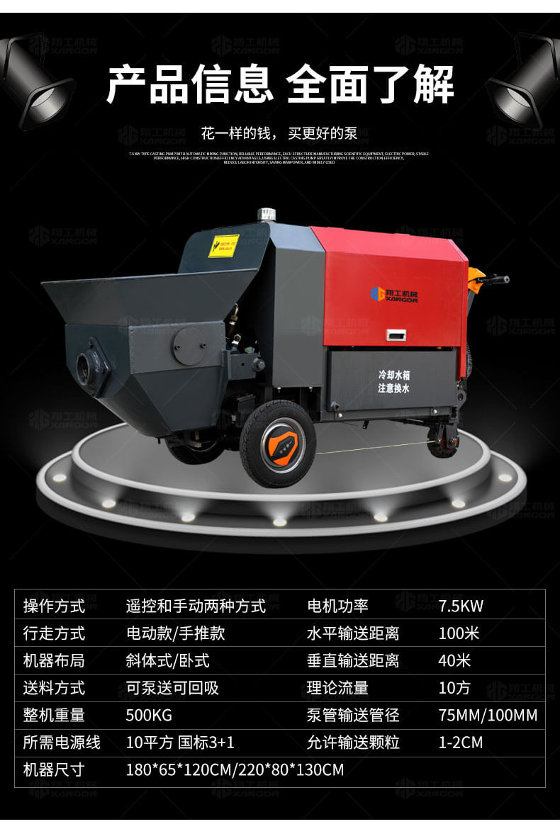 這款7.5KW型澆筑泵帶有自動(dòng)攪拌功能,性能可靠,設(shè)備各個(gè)結(jié)構(gòu)制造科學(xué),電機(jī)功率大、性能穩(wěn)定、施工效率高等優(yōu)勢,使用電動(dòng)澆筑泵大大提高了施工效率,降低勞動(dòng)強(qiáng)度,節(jié)約人工,被廣泛應(yīng)用。是工程施工的好幫手。
