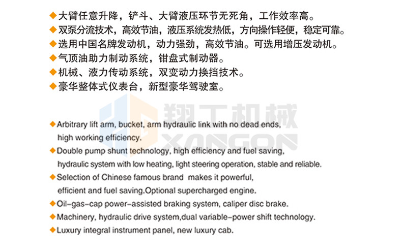 裝載機(jī)的作用: 主要用于鏟裝土壤、砂石、石灰、煤炭等散狀物料,也可對(duì)礦石、硬土等作輕度鏟挖作業(yè)。換裝不同的輔助工作裝置還可進(jìn)行推土、起重和其他物料如木材的裝卸作業(yè)。在道路、特別是在高等級(jí)公路施工中,裝載機(jī)用于路基工程的填挖、瀝青混合料和水泥混凝土料場(chǎng)的集料與裝料等作業(yè)。