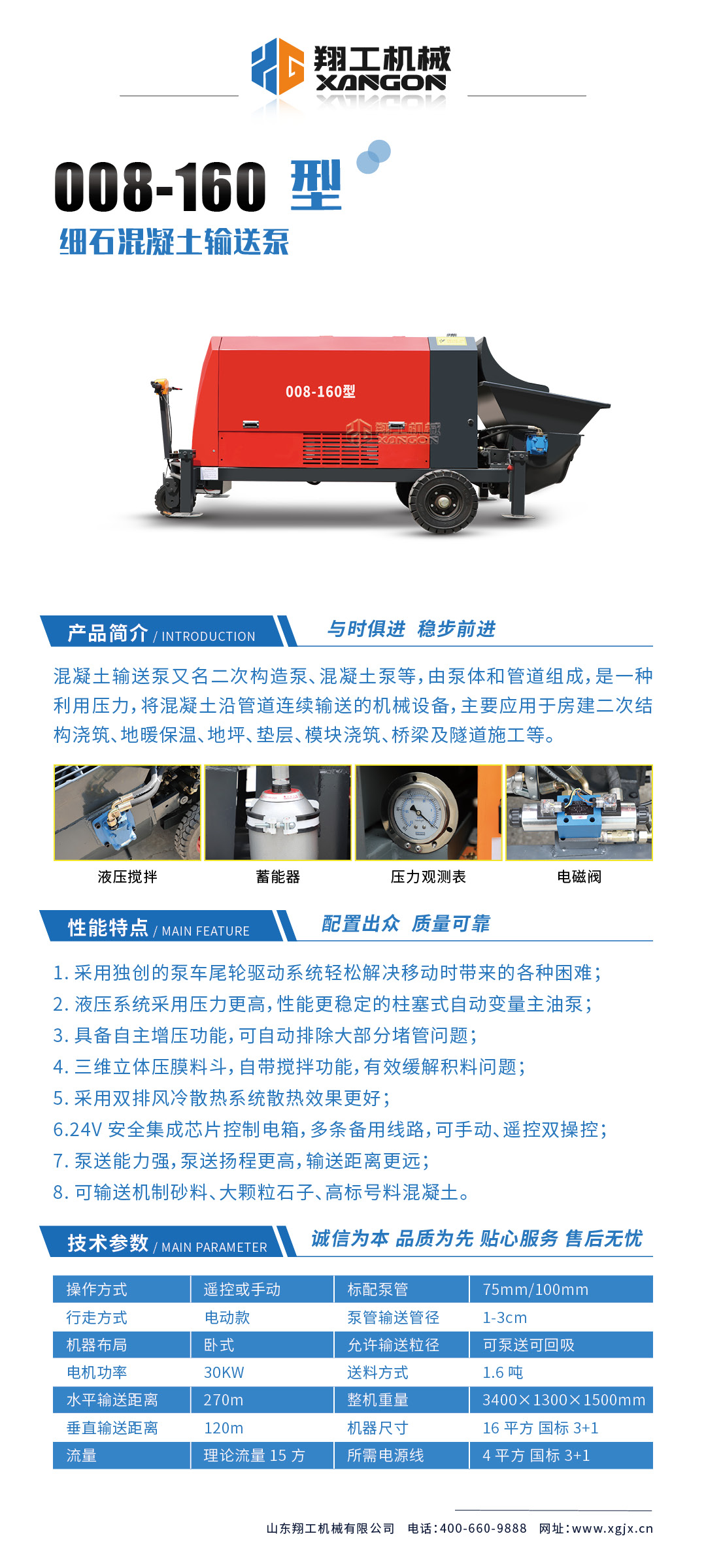 采用獨(dú)創(chuàng)的泵車(chē)尾輪驅(qū)動(dòng)系統(tǒng)輕松解決移動(dòng)時(shí)帶來(lái)的各種困難,采用雙排風(fēng)冷散熱系統(tǒng)散熱效果更好,液壓系統(tǒng)采用壓力更高,性能更穩(wěn)定的柱塞式自動(dòng)變量主油泵,采用先進(jìn)的三維立體壓模一體式自動(dòng)攪拌料斗可輸送機(jī)制砂,高標(biāo)號(hào)混凝土,有效緩解積料問(wèn)題。