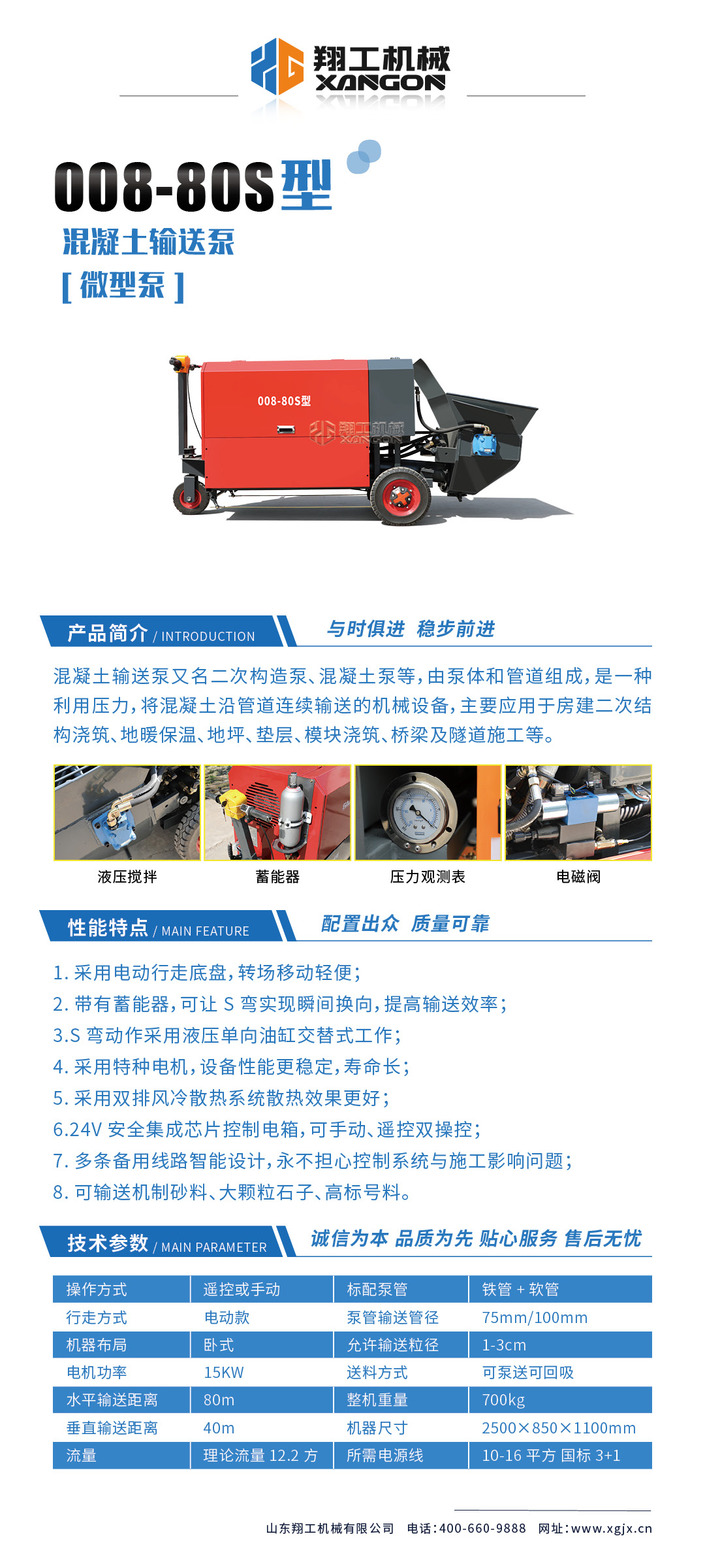 采用電動行走底盤移動更輕便,采用雙排風冷散熱系統(tǒng)散熱效果更好,液壓系統(tǒng)采用國內知名廠商葉片泵,故障率低,壽命更長,性能更穩(wěn)定,輸送距離更遠揚程更高,打料速度更快。