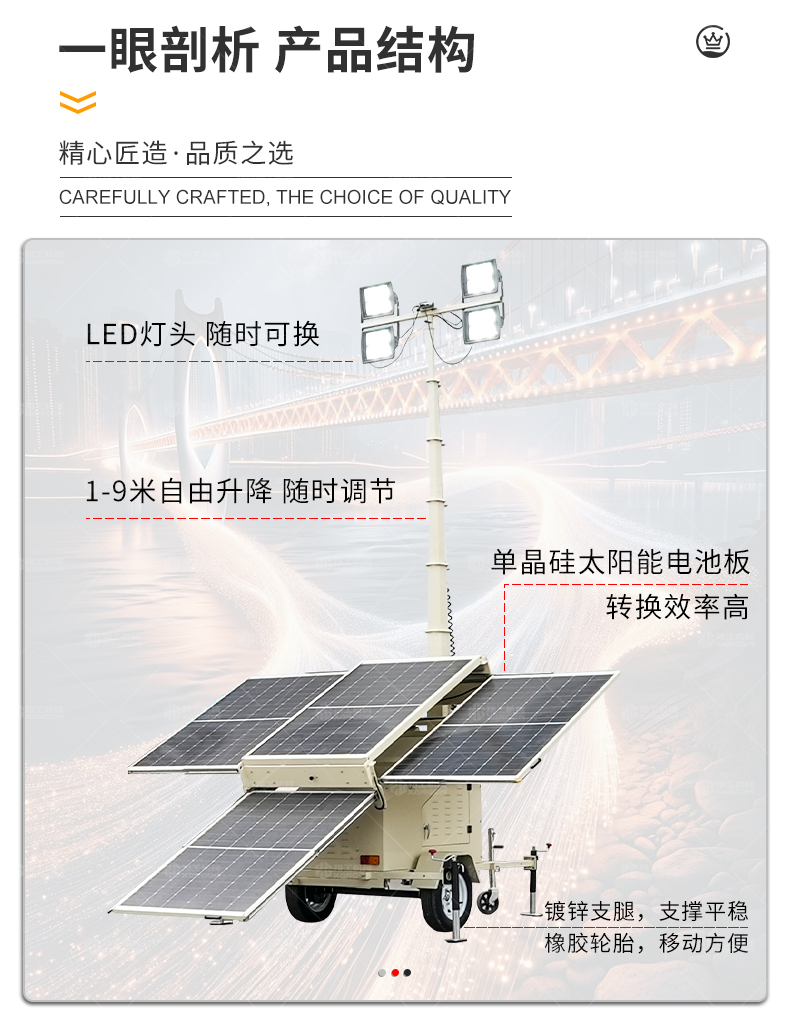 太陽(yáng)能燈車采用高效光伏板與鋰電池組合,白天蓄電,夜間自動(dòng)照明,節(jié)能環(huán)保。配備高亮度LED燈,照射范圍廣,適用于道路施工、應(yīng)急搶險(xiǎn)、夜間作業(yè)等場(chǎng)景。移動(dòng)靈活,防水防塵,無(wú)需外接電源,續(xù)航持久。結(jié)構(gòu)堅(jiān)固,操作簡(jiǎn)便,是戶外臨時(shí)照明的理想選擇,兼顧經(jīng)濟(jì)性與實(shí)用性。