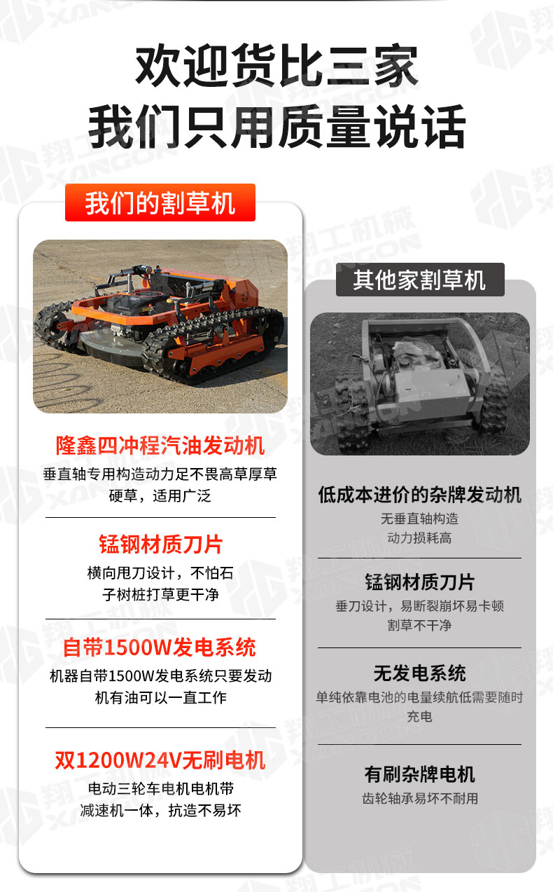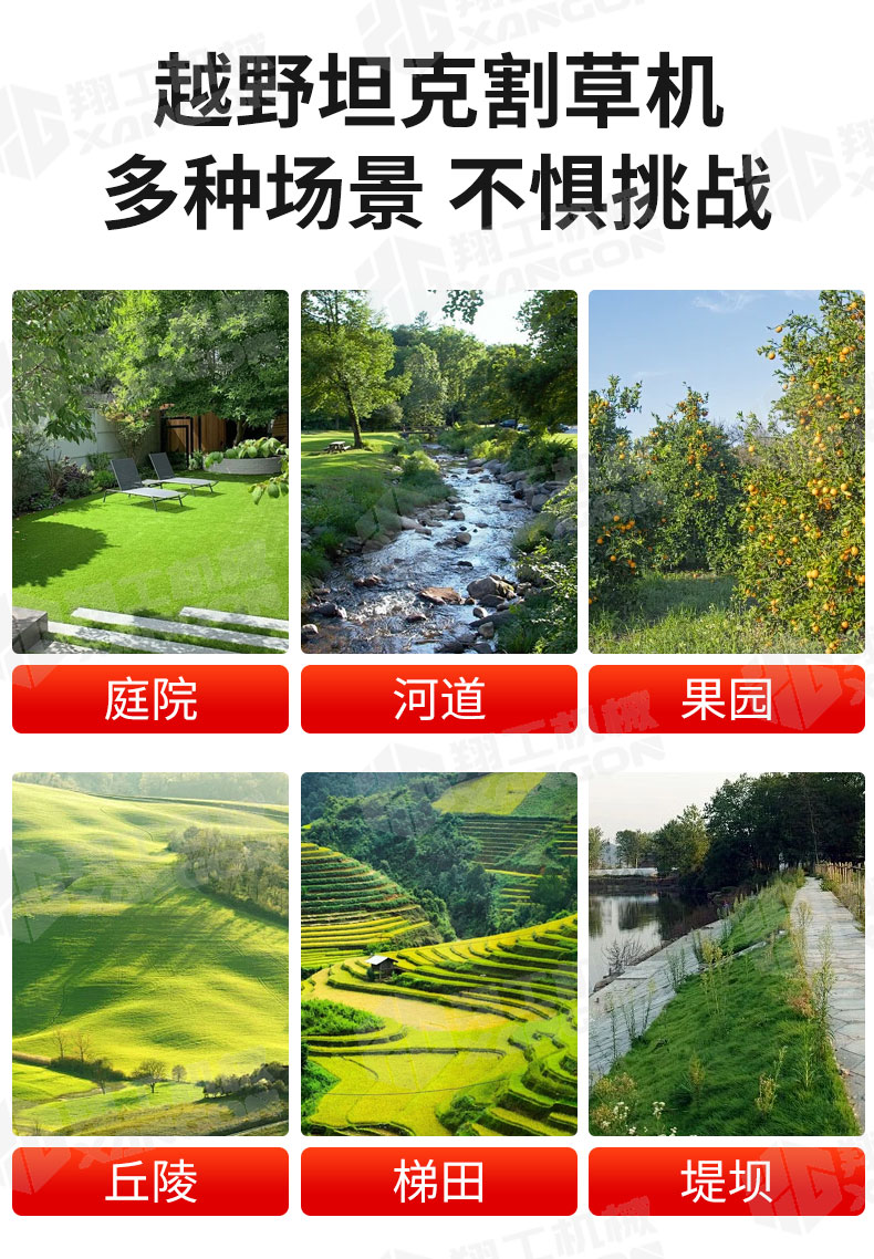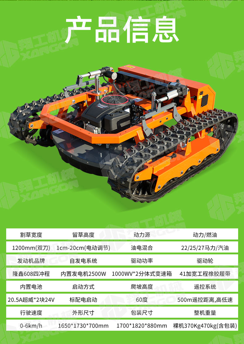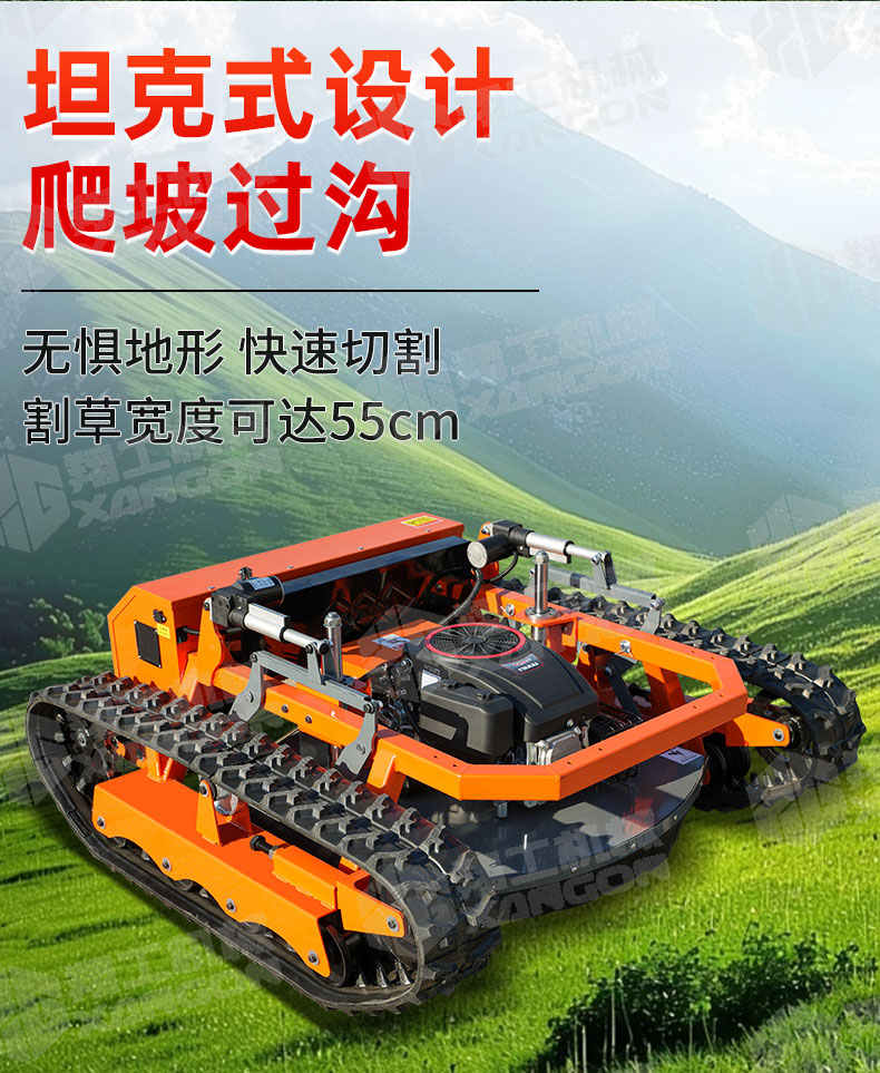 XG-1200是一款革新性的遙控坦克割草機(jī),專(zhuān)為復(fù)雜地形設(shè)計(jì)。其獨(dú)特的橡膠履帶底盤(pán),具備卓越的越野與爬坡能力,輕松應(yīng)對(duì)陡坡、濕滑及不平整草坪。無(wú)線遙控操作,靈活精準(zhǔn),極大提升了割草效率與安全性,是果園、荒地及專(zhuān)業(yè)園藝工作的理想之選。