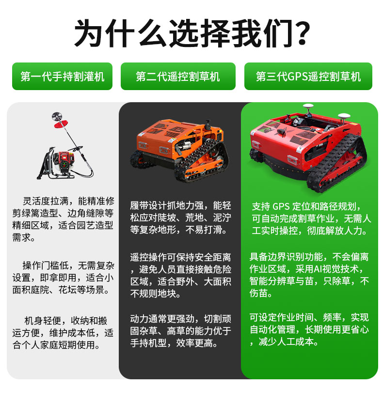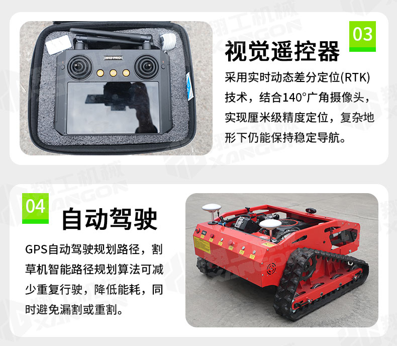 【GPS衛(wèi)星定位遙控割草機(jī)】搭載高精度GPS定位系統(tǒng),支持遠(yuǎn)程遙控與自主路徑規(guī)劃,輕松應(yīng)對(duì)復(fù)雜地形。具備智能避障、雨天保護(hù)及電子圍欄功能,一鍵操作即可高效完成割草任務(wù)。省時(shí)省力,讓除草更智能、更精準(zhǔn),只除草,不傷苗。全國(guó)免費(fèi)咨詢熱線400-660-9888。
