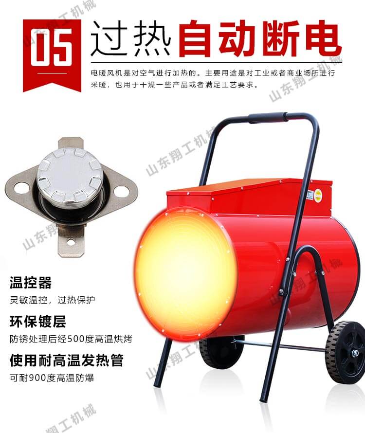 暖風(fēng)機優(yōu)點: 1、純銅全封閉電機 2、防爆不銹管(不銹管發(fā)熱元件作熱源保證產(chǎn)品的可靠) 3、取暖溫度可自動調(diào)節(jié)(調(diào)節(jié)功率) 電暖風(fēng)機是由通風(fēng)機,電動機及散熱器組合而成的聯(lián)合機組。適用于空氣允許再循環(huán)的各種類型車間,當(dāng)空氣中不含灰塵,易燃性的氣體時,可作為循環(huán)空氣采暖之用。